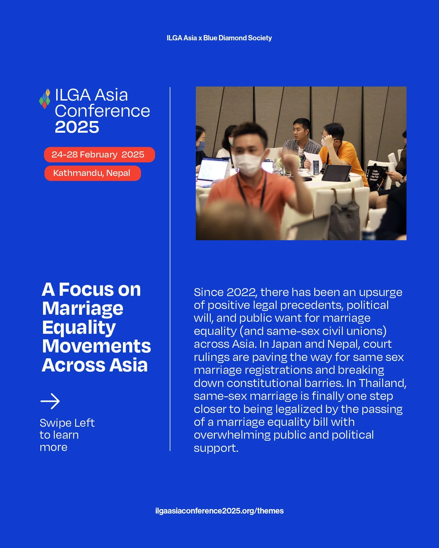 With the passing of Thailand’s marriage equality bill, groundbreaking rulings for marriage registrations in Japan and Nepal, and the recognition of cross-strait same-sex marriages in Taiwan, #ILGAAsiaConference2025 will look at Marriage Equality Movements in Asia, and the communities and initiatives that stood their ground through the years.